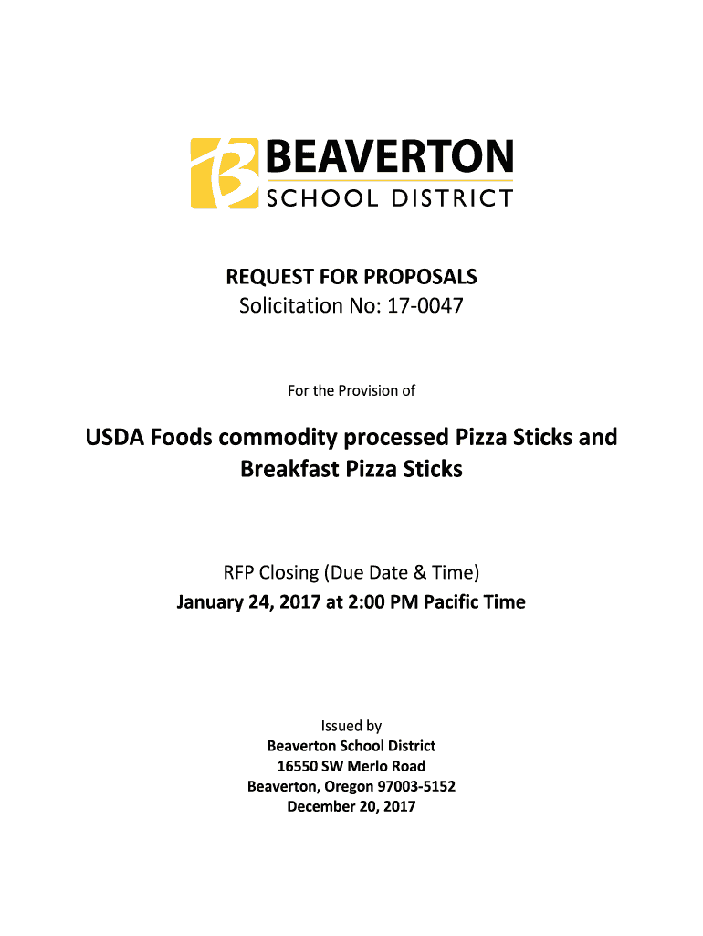 REQUEST FOR PROPOSALS Solicitation No: 170047For the Provision of USDA Foods commodity processed Pizza Sticks and Breakfast Pizza Sticks RFP Closing (Due Date & Time) January 24, 2017, at 2:00 PM
