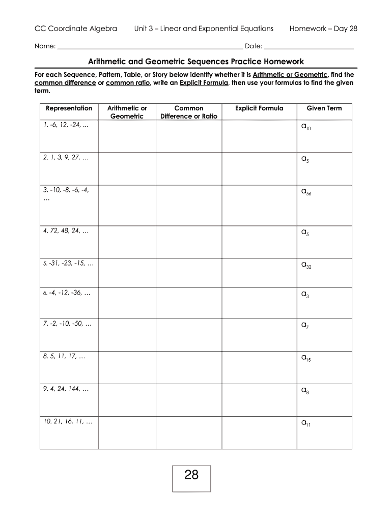 CC Coordinate Algebraic 3 Linear and Exponential EquationsHomework Day 28Name: Date: Arithmetic and Geometric Sequences Practice Homework For each Sequence, Pattern, Table, or Story below identify