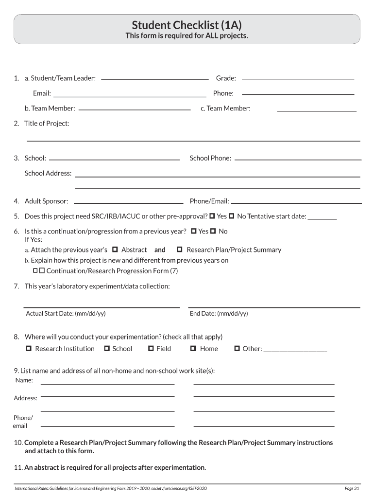 Student Checklist (1A)This form is required for ALL projects.1. a. Student/Team Leader:Grade:Email:Phone:b. Team Member:c. Team Member: 2. Title of Project:3. School:School Phone:School Address:4.