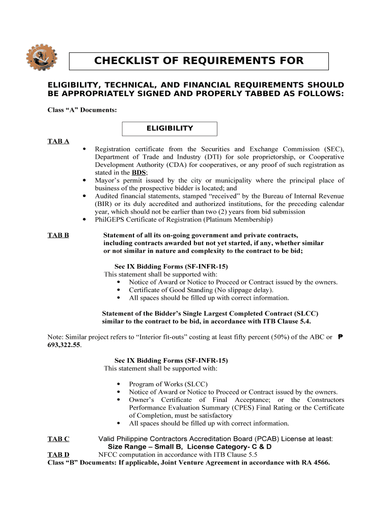 CHECKLIST OF REQUIREMENTS FOR BIDDERS ELIGIBILITY, TECHNICAL, AND FINANCIAL REQUIREMENTS SHOULD BE APPROPRIATELY SIGNED AND PROPERLY TABBED AS FOLLOWS: Class A Documents: ELIGIBILITY DOCUMENTS A TAB