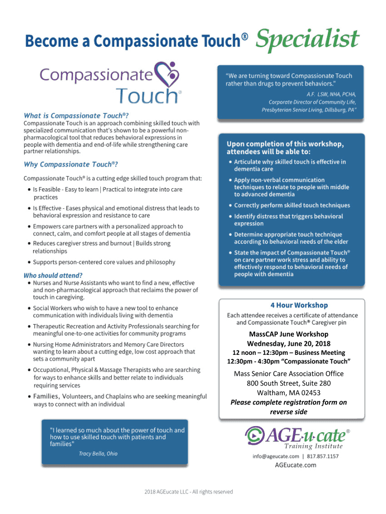 Mass CAP June Workshop Wednesday, June 20, 201812 noon 12:30pm Business Meeting 12:30pm 4:30pm Compassionate Touch Mass Senior Care Association Office 800 South Street, Suite 280 Waltham, MA 02453