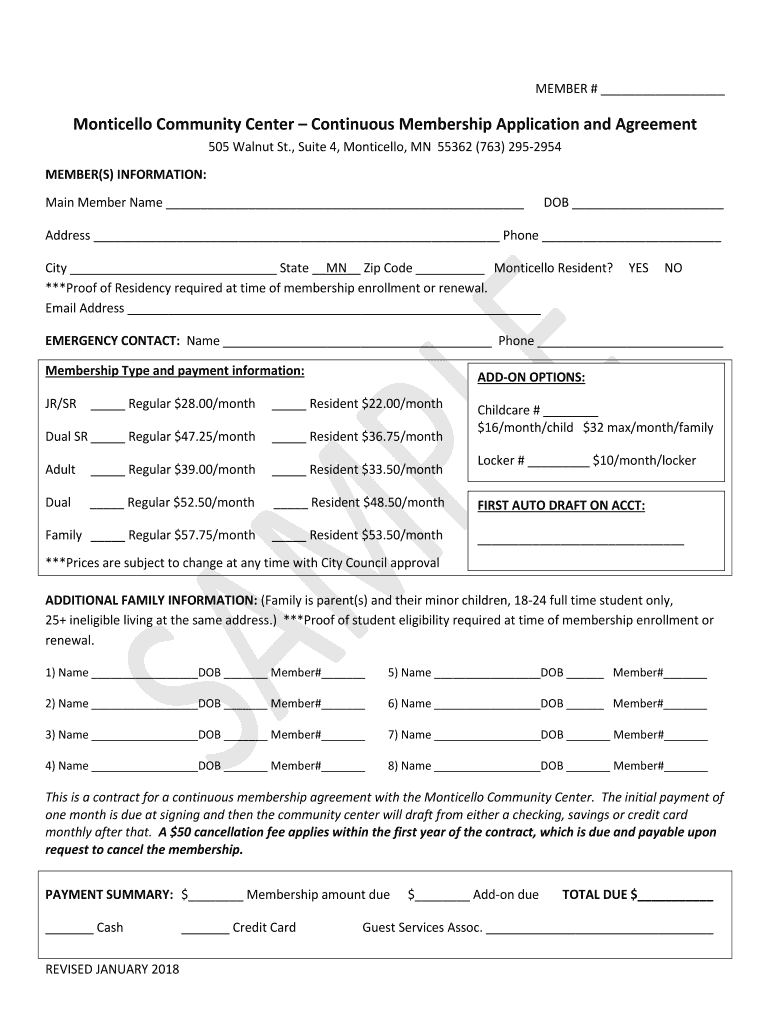 MEMBER # Monticello Community Center Continuous Membership Application and Agreement 505 Walnut St., Suite 4, Monticello, MN 55362 (763) 2952954 MEMBER(S) INFORMATION: Main Member Name DOB Address