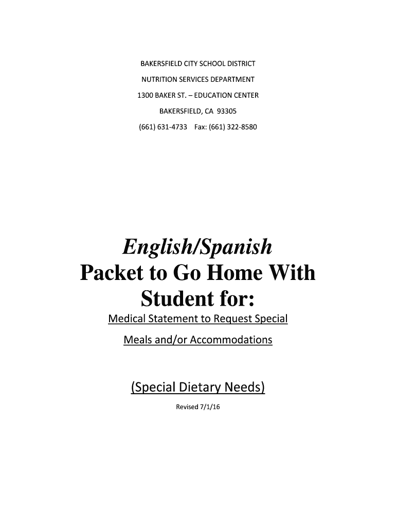 BAKERSFIELD CITY SCHOOL DISTRICT NUTRITION SERVICES DEPARTMENT 1300 BAKER ST. EDUCATION CENTER BAKERSFIELD, CA 93305 (661) 6314733 Fax: (661) 3228580English/Spanish Packet to Go Home With Student