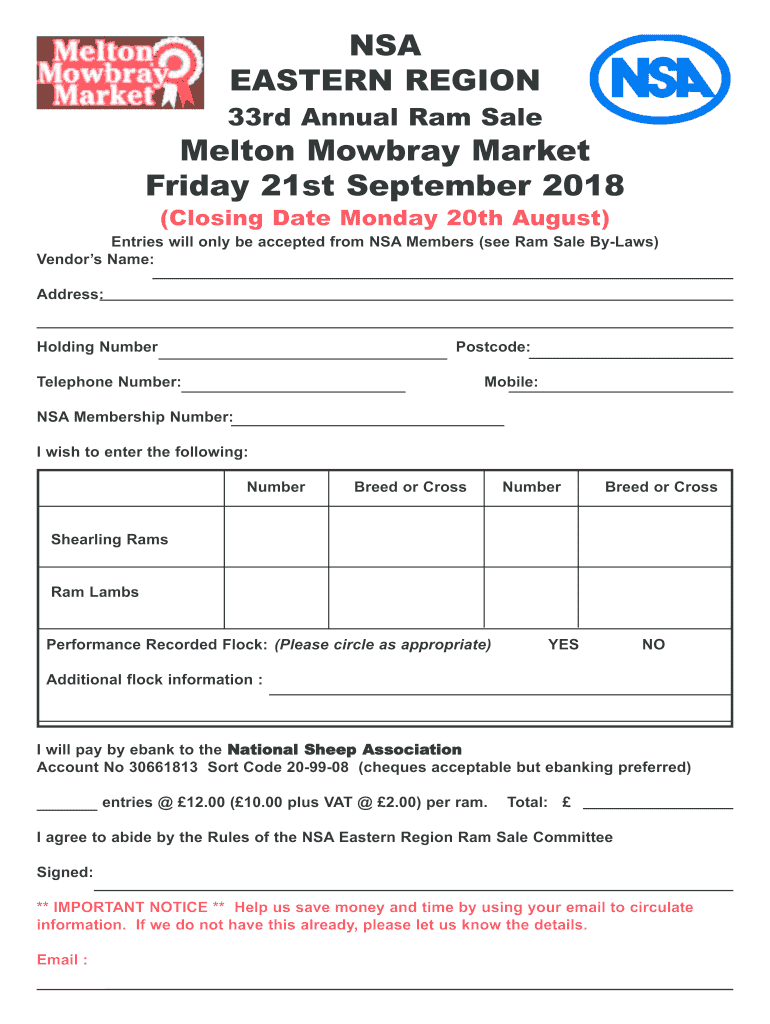 (Closing Date Monday 20th August)Entries will only be accepted from NSA Members (see Ram Sale Bylaws)