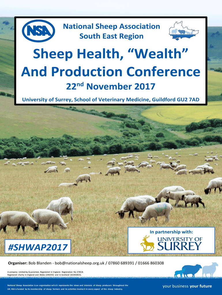 National Sheep Association South East RegionSheep Health, Wealth And Production Conference 22nd November 2017 University of Surrey, School of Veterinary Medicine, Guildford GU2 7ADIn partnership with:#SHWAP2017