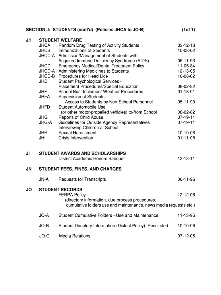 SECTION J: STUDENTS (cont\'d) (Policies HCA to JOB)