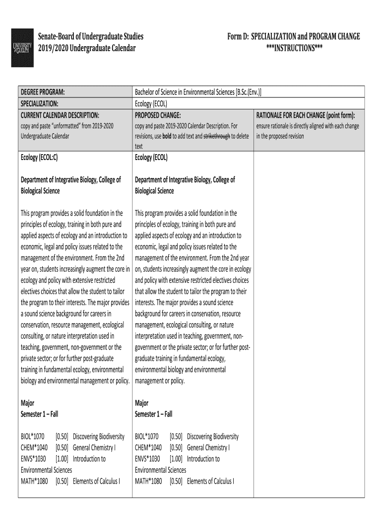 Skateboard of Undergraduate Studies 2019/2020 Undergraduate CalendarForm D: SPECIALIZATION and PROGRAM CHANGE ***INSTRUCTIONS***DEGREE PROGRAM: SPECIALIZATION: CURRENT CALENDAR DESCRIPTION:Bachelor