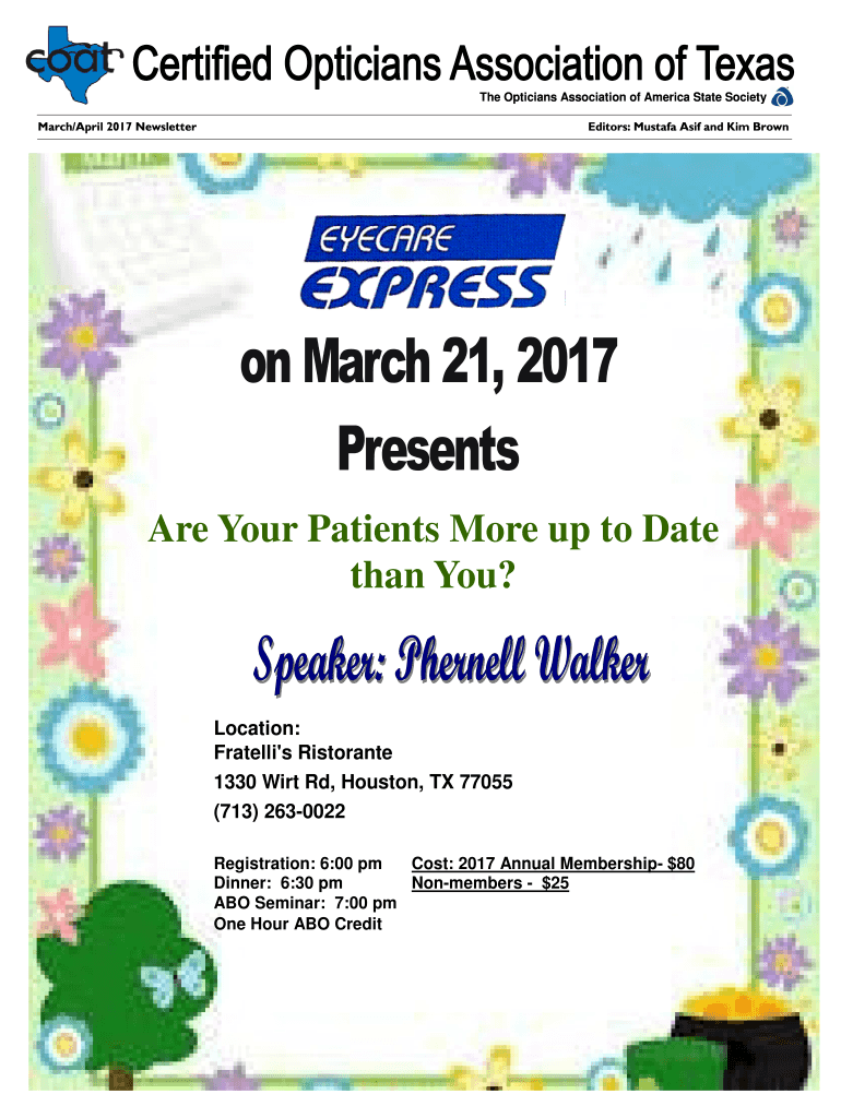 The Opticians Association of America State Society March/April 2017 NewsletterEditors: Mustafa Asif and Kim Browne Your Patients More up to Date than You? Location: Fratelli's Pastorate 1330 Wire