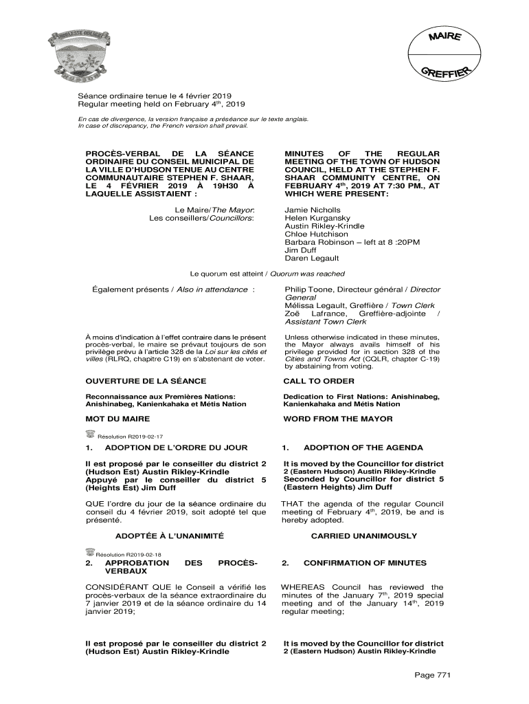 Since ordinary tenure LE 4 frier 2019 Regular meeting held on February 4th, 2019 En CAS de divergence, la version franchise a prance SUR LE text angles. In case of discrepancy, the French version