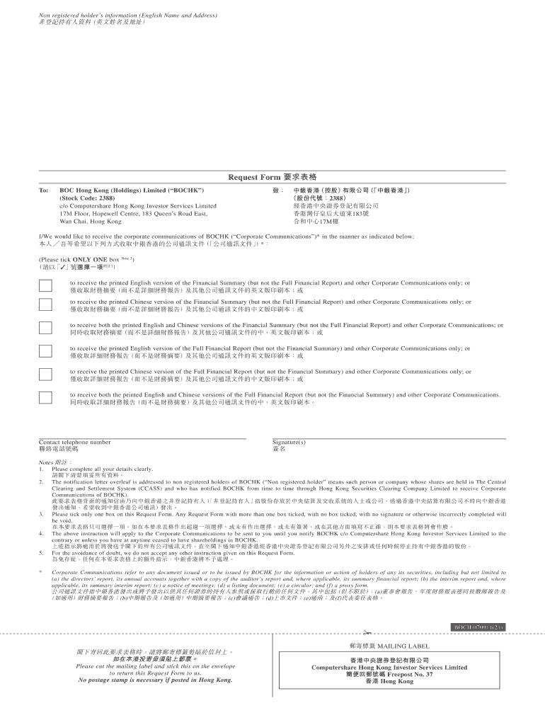 Non registered holder s information (English Name and Address) Request Form To: BOC Hong Kong (Holdings) Limited (BOCK) (Stock Code: 2388) c/o Computer share Hong Kong Investor Services Limited 17M