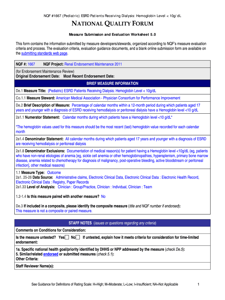 NSF #1667 (Pediatric) ESD Patients Receiving Dialysis: Hemoglobin Level 10g/national QUALITY FORUM Measure Submission and Evaluation Worksheet 5.0This form contains the information submitted by measure