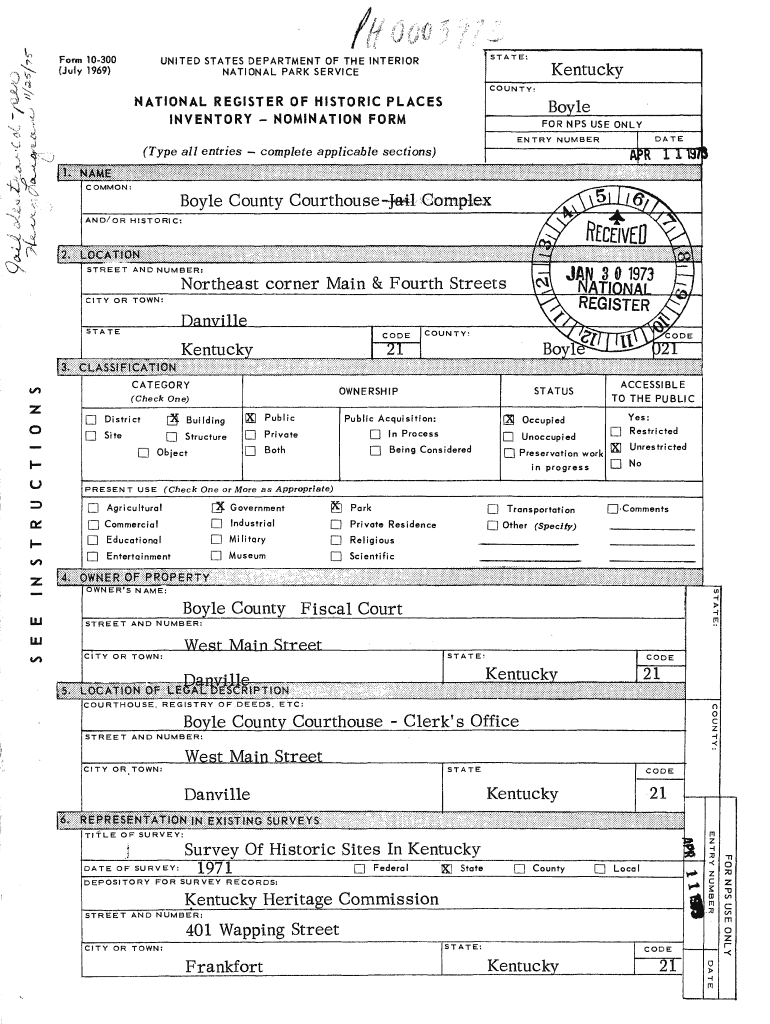 Form 10300 July 1969)UNITED STATES DEPARTMENT OF THE INTERIOR NATIONAL PARK SERVICE Kentucky COUNTY:NATIONAL REGISTER OF HISTORIC PLACES INVENTORY NOMINATION FORM Boyle FOR NPS USE ONLY ENTRY NUMBER(Type