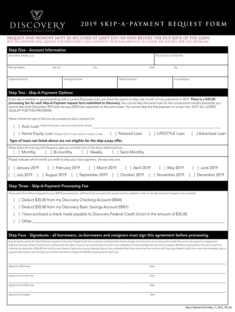 2 0 1 9 S k i p a pay e n t r e q u e s t f or m Request and payment must be received at least ten (10) days before the due date of the loan. Not all members will qualify for discoveries skipapayment