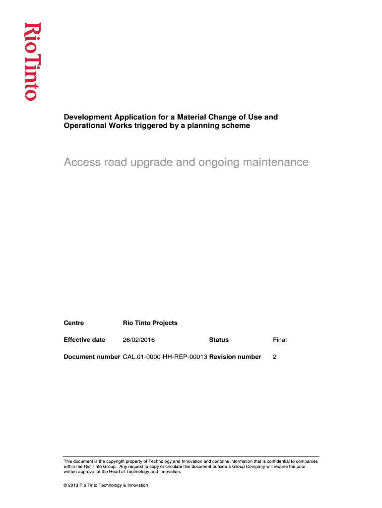 Operational Works triggered by a planning schemeAccess road upgrade and ongoing maintenanceCentreRio Into ProjectsEffective date26/02/2016StatusDocument