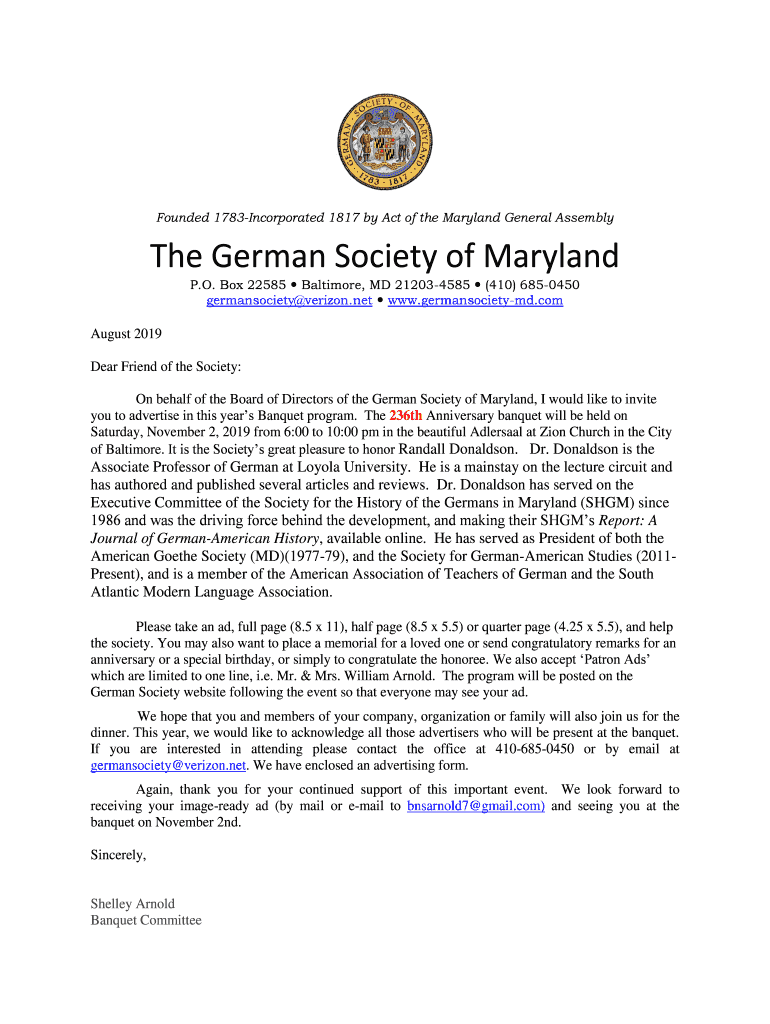 Founded 1783Incorporated 1817 by Act of the Maryland General Assembly German Society of Maryland P.O. Box 22585 Baltimore, MD 212034585 (410) 6850450 germansociety Verizon.net www.germansocietymd.comAugust