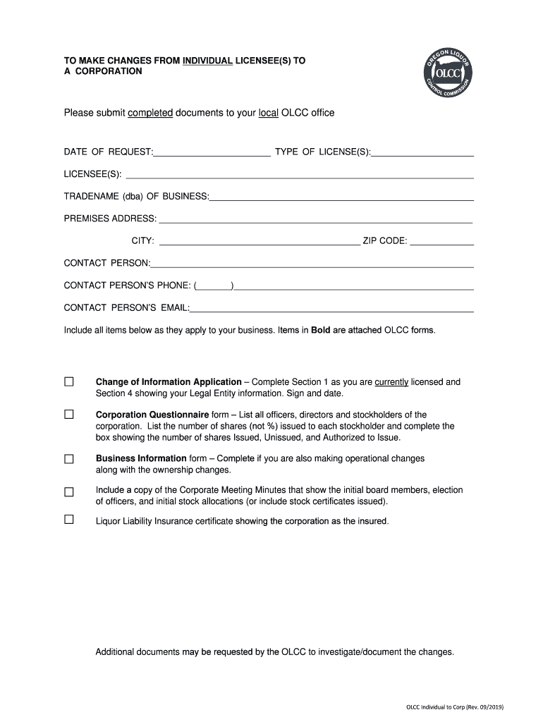 TO MAKE CHANGES FROM INDIVIDUAL LICENSEE(S) TO A CORPORATIONPlease submit completed documents to your local LCC officiate OF REQUEST: TYPE OF LICENSE(S): LICENSEE(S): TRADEMARK (DBA) OF BUSINESS: