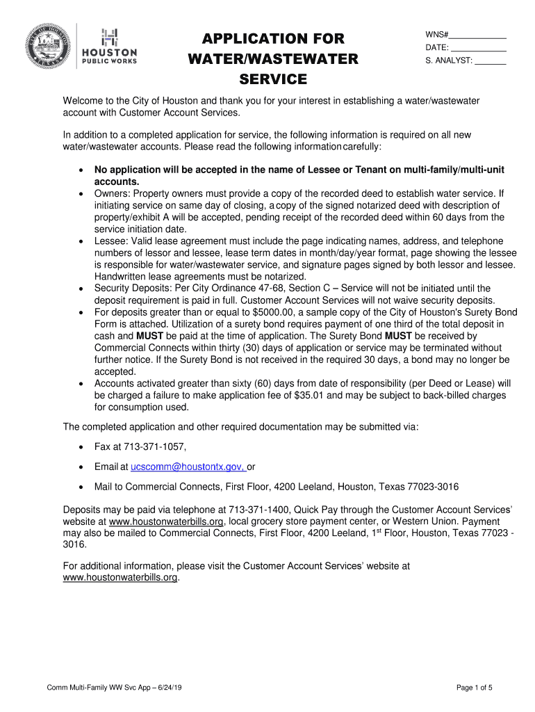 APPLICATION FOR WATER/WASTEWATER SERVICE WNS# DATE: S. ANALYST: Welcome to the City of Houston, and thank you for your interest in establishing a water/wastewater account with Customer Account Services.