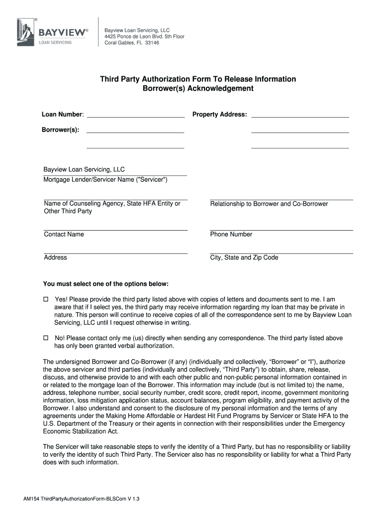 Bayview Loan Servicing, LLC 4425 Ponce de Leon Blvd. 5th Floor Coral Gables, FL 33146Third Party Authorization Form To Release Information Borrower(s) AcknowledgementLoan Number: Borrower(s):Property