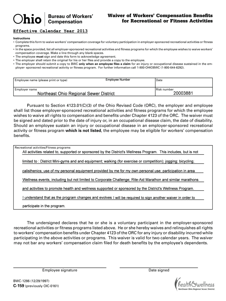 Waiver of Workers Compensation Benefits for Recreational or Fitness Activities Effective Calendar Year 2013 Instructions Complete this form to waive workers compensation coverage for voluntary participation