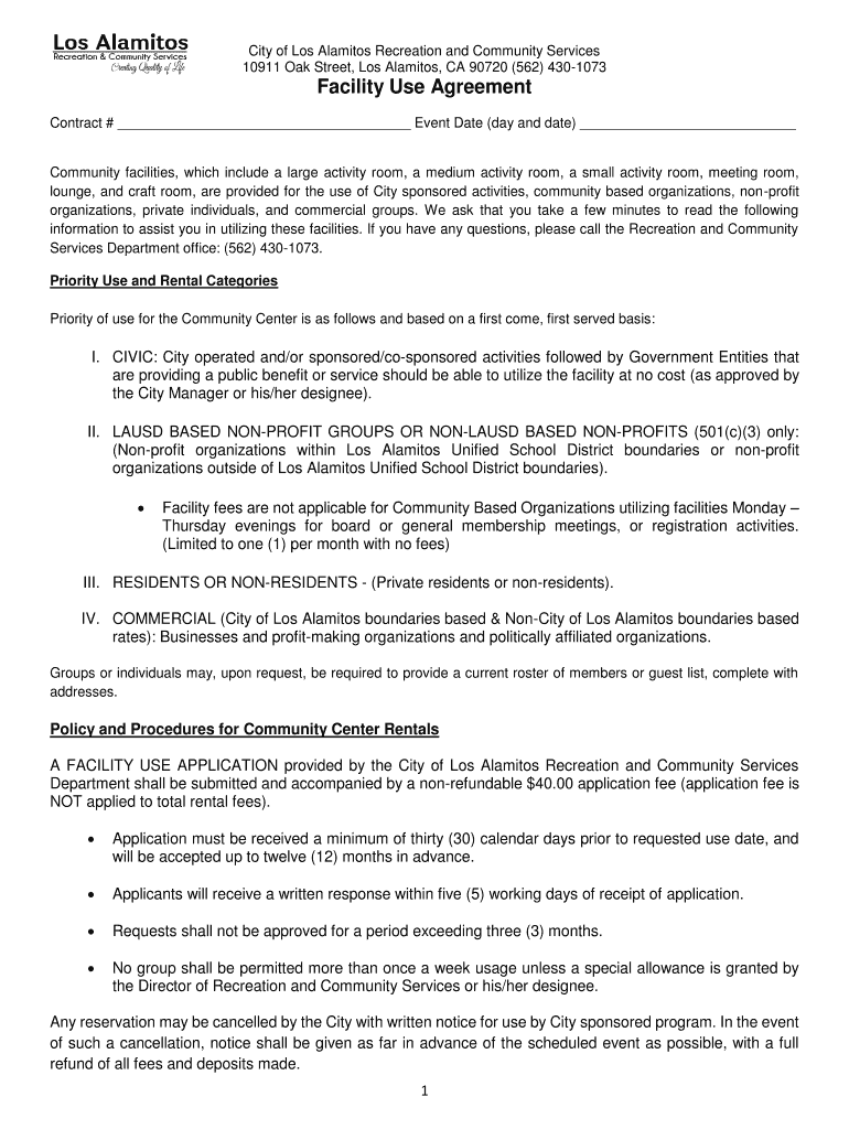 City of Los Calamitous Recreation and Community Services 10911 Oak Street, Los Calamitous, CA 90720 (562) 4301073Facility Use Agreement Contract # Event Date (day and date) Community facilities, which