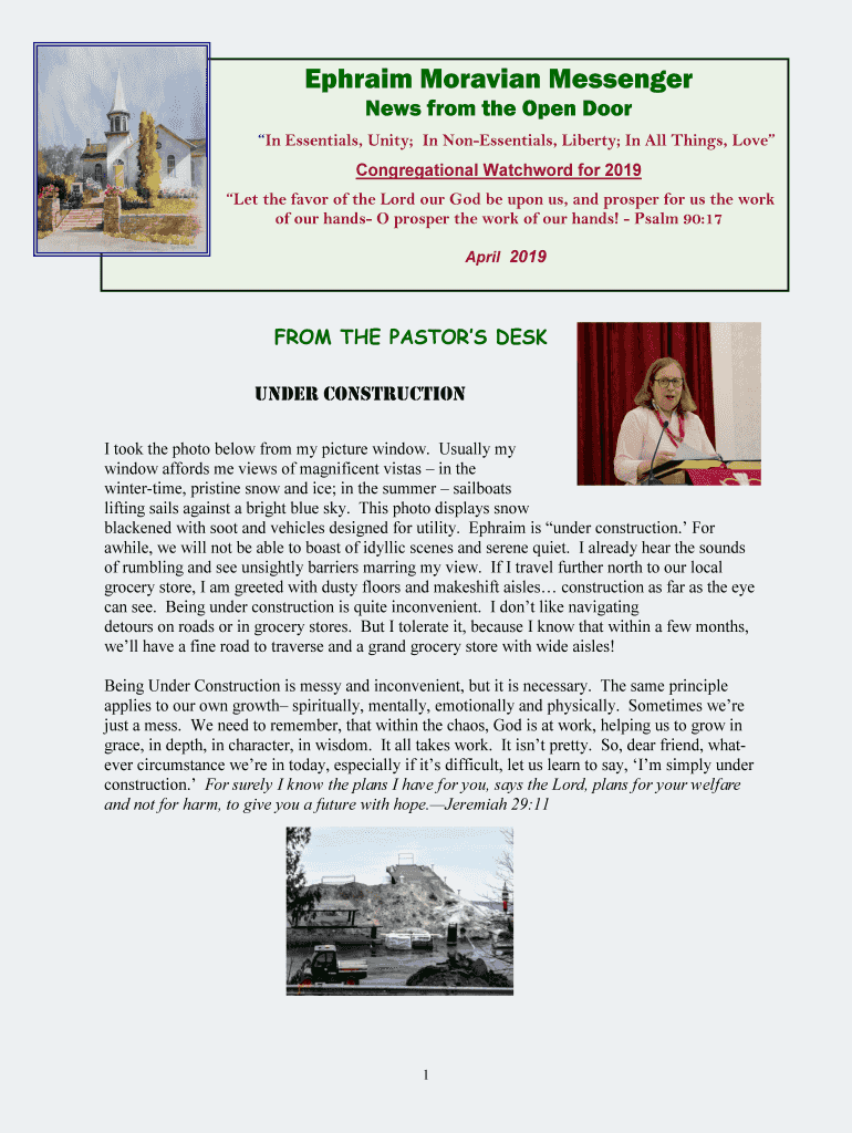 Ephraim Moravian Messenger News from the Open Door In Essentials, Unity; In Nonessential, Liberty; In All Things, Love Congregational Watchword for 2019 Let the favor of the Lord our God be upon us,