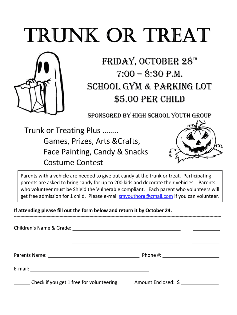 Trunk or Treat Friday, October 28 7:00 8:30 p.m. School Gym & Parking Lot $5.00 per Child sponsored by High School Youth Groupthink or Treating Plus. Games, Prizes, Arts crafts, Face Painting, Candy