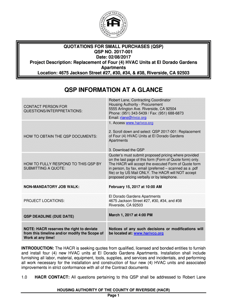QUOTATIONS FOR SMALL PURCHASES (DSP) DSP NO. 2017001 Date: 02/08/2017 Project Description: Replacement of Four (4) HVAC Units at El Dorado Gardens Apartments Location: 4675 Jackson Street #27, #30,