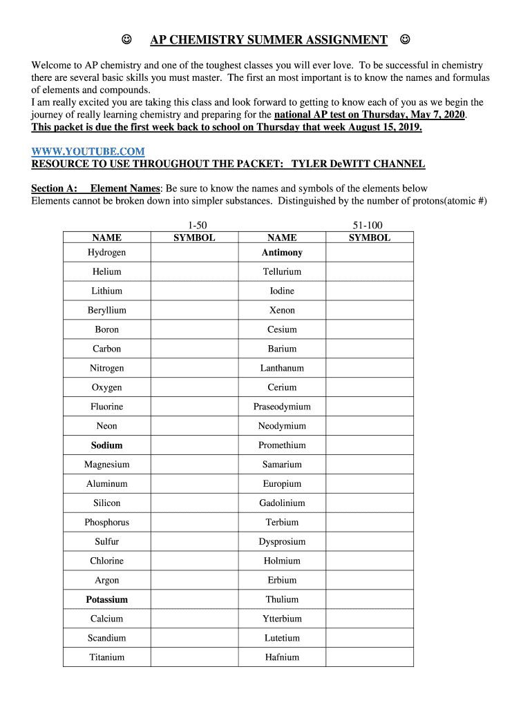 AP CHEMISTRY SUMMER ASSIGNMENTWelcome to AP chemistry and one of the toughest classes you will ever love. To be successful in chemistry