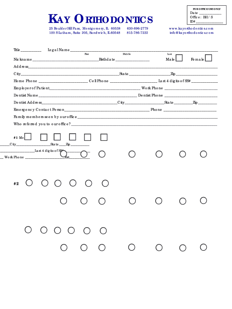 KAY ORTHODONTICS 25 Boulder Hill Pass, Montgomery, IL 60538 100 S Latham, Suite 205, Sandwich, IL 605486308962779 8157867232FOR OFFICE USE Validate Office: BH / S ID# www.kayorthodontics.com info