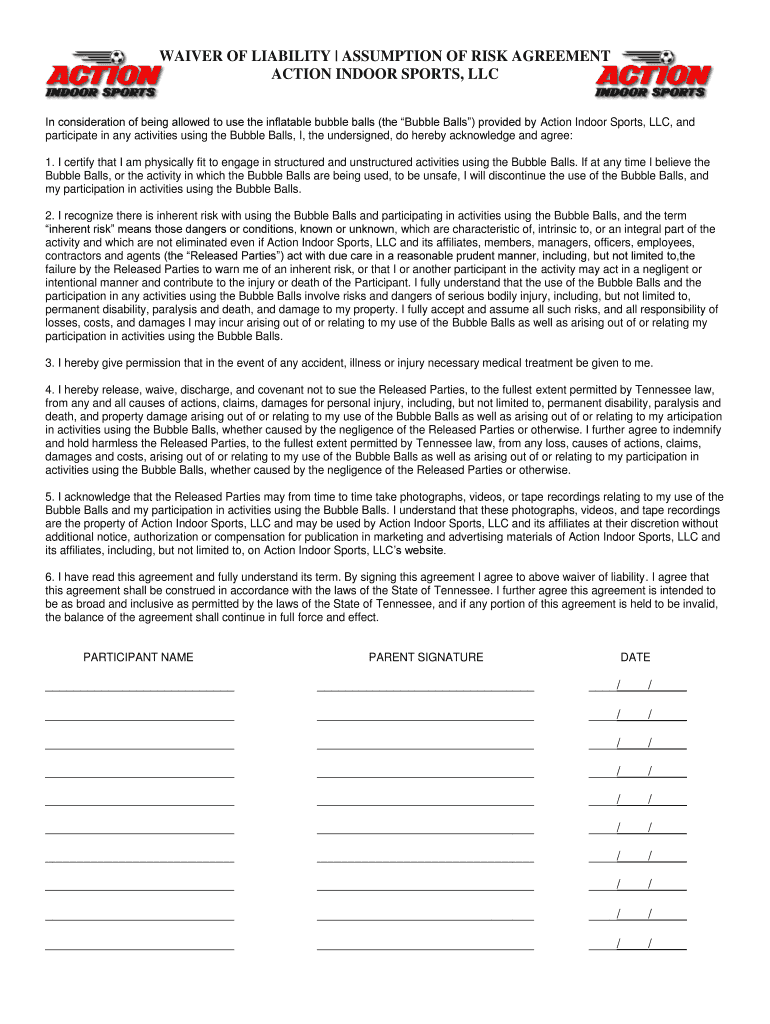 WAIVER OF LIABILITY ASSUMPTION OF RISK AGREEMENT ACTION INDOOR SPORTS, LLC In consideration of being allowed to use the inflatable bubble balls (the Bubble Balls) provided by Action Indoor Sports,