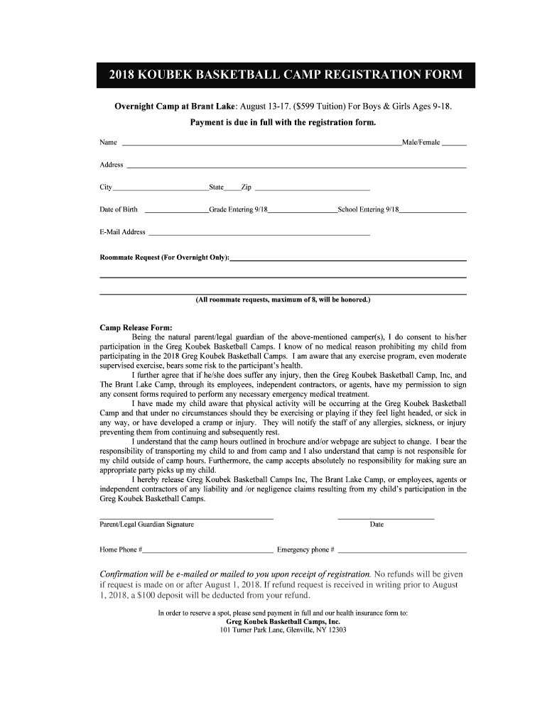 2018 KOBE BASKETBALL CAMP REGISTRATION FORM Overnight Camp at Brant Lake: August 1317. ($599 Tuition) For Boys & Girls Ages 918. Payment is due in full of the registration form. Name Male/FemaleAddress