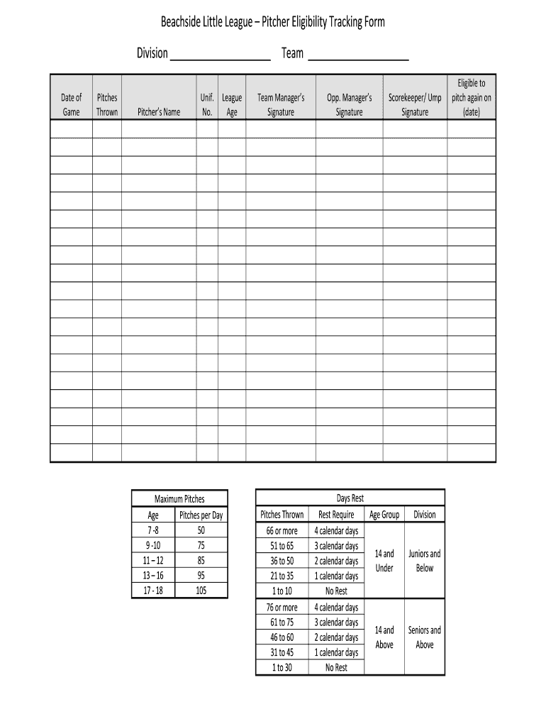 Beachside Little League Pitcher Eligibility Tracking Form Division Date of GamePitches ThrownPitchers NameUnif. No. League Maximum Pitches Age Pitches per Day 7 8 50 9 10 75 11 12 85 13 16 95 17 18