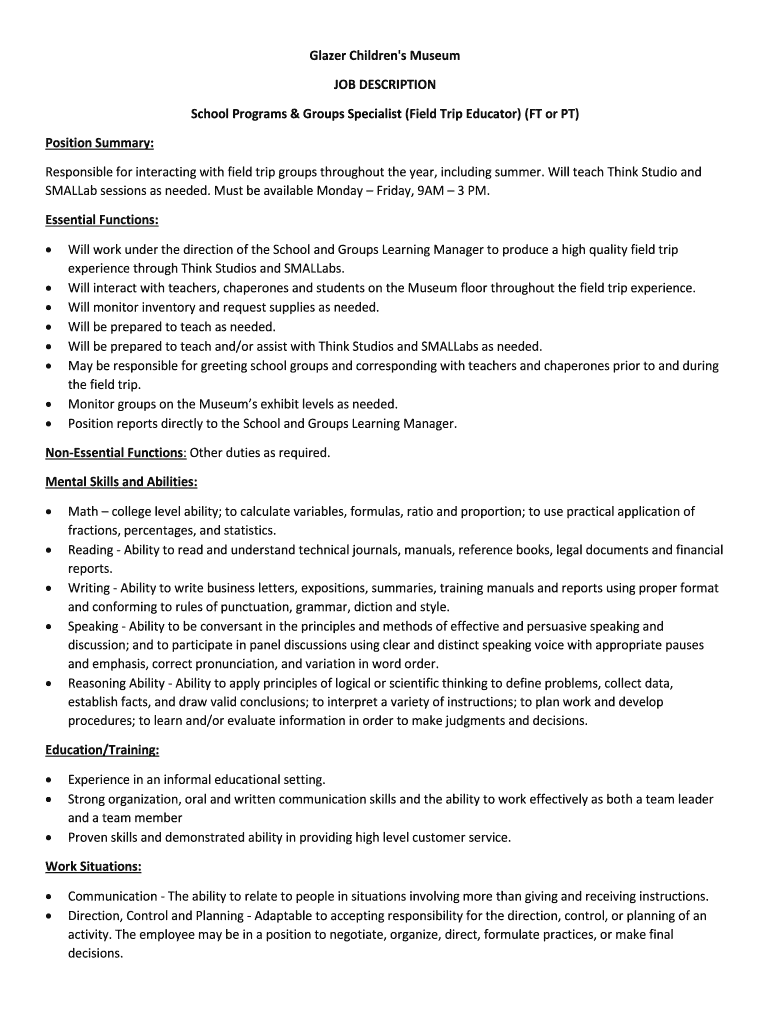 Get the free Glazer Children's Museum JOB DESCRIPTION School Programs ...
