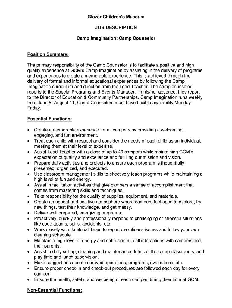 Get the free Glazer Children's Museum JOB DESCRIPTION Camp