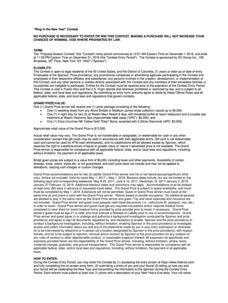 Ring in the New Year Contest NO PURCHASE IS NECESSARY TO ENTER OR WIN THIS CONTEST. MAKING A PURCHASE WILL NOT INCREASE YOUR CHANCES OF WINNING. VOID WHERE PROHIBITED BY LAW.TERM: The Proposal Season