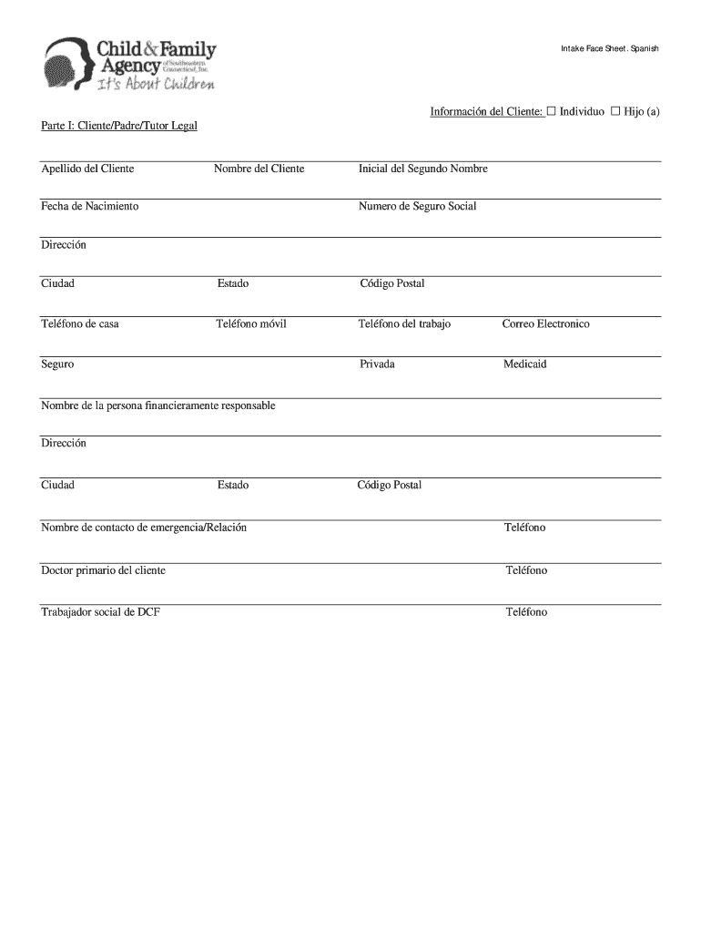 Intake Face Sheet. SpanishInformacin Del Client: Individual Part I: Client/Padre/Tutor LegalApellido del ClienteNombre del ClienteFecha de NacimientoInicial del Segundo Hombre Number de Seguro SocialDireccin