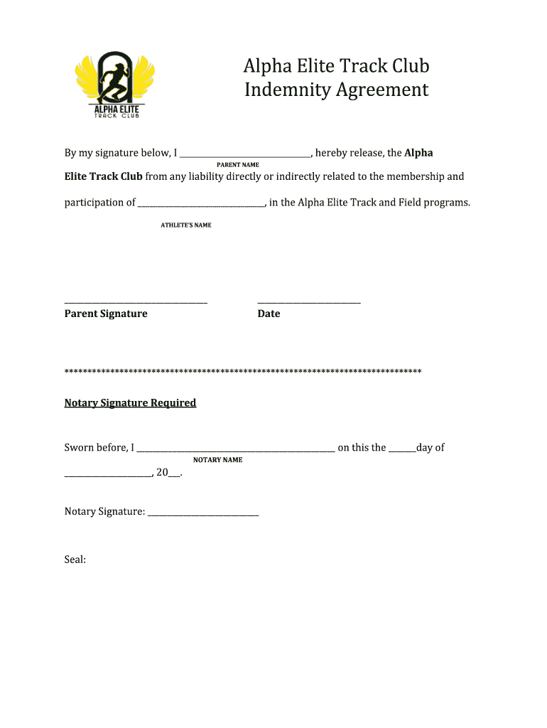Alpha Elite Track Club Indemnity Agreement By my signature below, I, hereby release, the Alpha PARENT Nameplate Track Club from any liability directly or indirectly related to the membership and participation