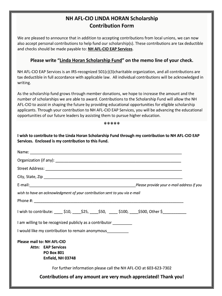 Get the free NH AFL-CIO LINDA HORAN Scholarship Contribution Form