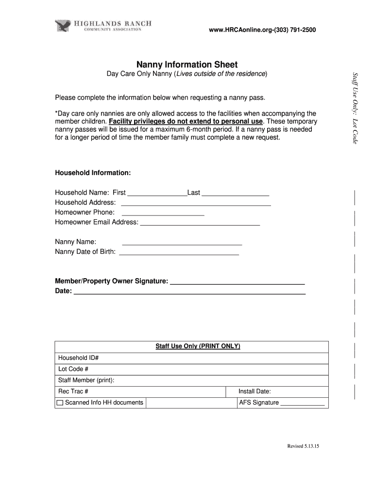WWW.HRCAonline.org(303) 7912500Nanny Information SheetPlease complete the information below when requesting a nanny pass.