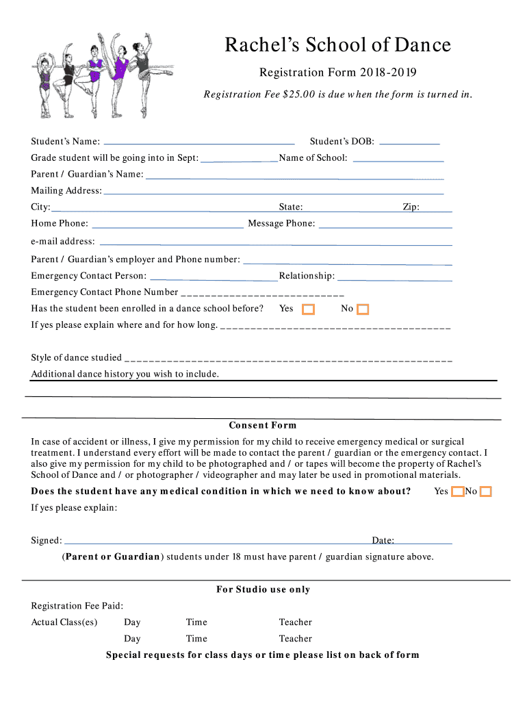 Rachel's School of Dance Registration Form 20182019 Registration Fee $25.00 is due when the form is turned in. Students Name:Students DOB:Grade student will be going into in Sept:Name of School:Parent