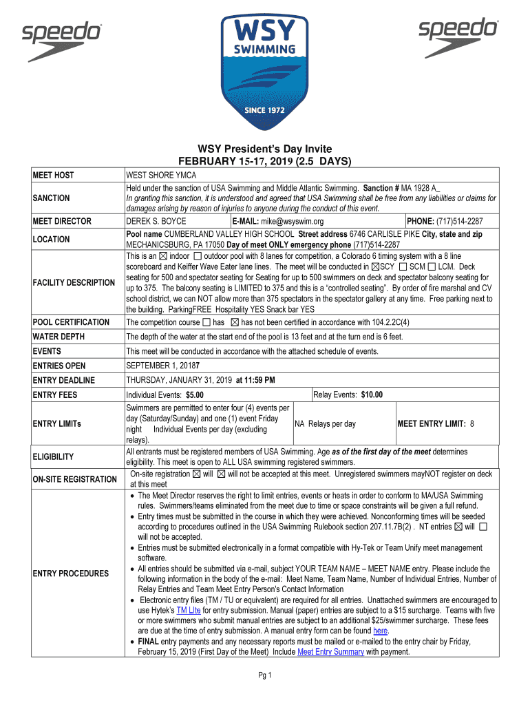 WAY Presidents' Day Invite FEBRUARY 1517, 2019 (2.5 DAYS) MEET HOSTEL CERTIFICATIONS SHORE YMCA Held under the sanction of USA Swimming and Middle Atlantic Swimming. Sanction # MA 1928 A In granting