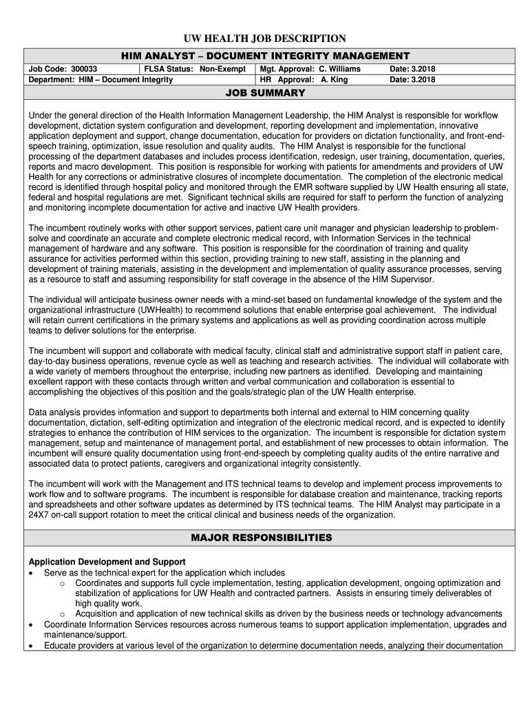 UW HEALTH JOB DESCRIPTION HIM ANALYST DOCUMENT INTEGRITY MANAGEMENT Job Code: 300033 FLEA Status: Nonexempt Department: HIM Document Integrity. Approval: C. Williams HR Approval: A. Ingrate: 3.2018