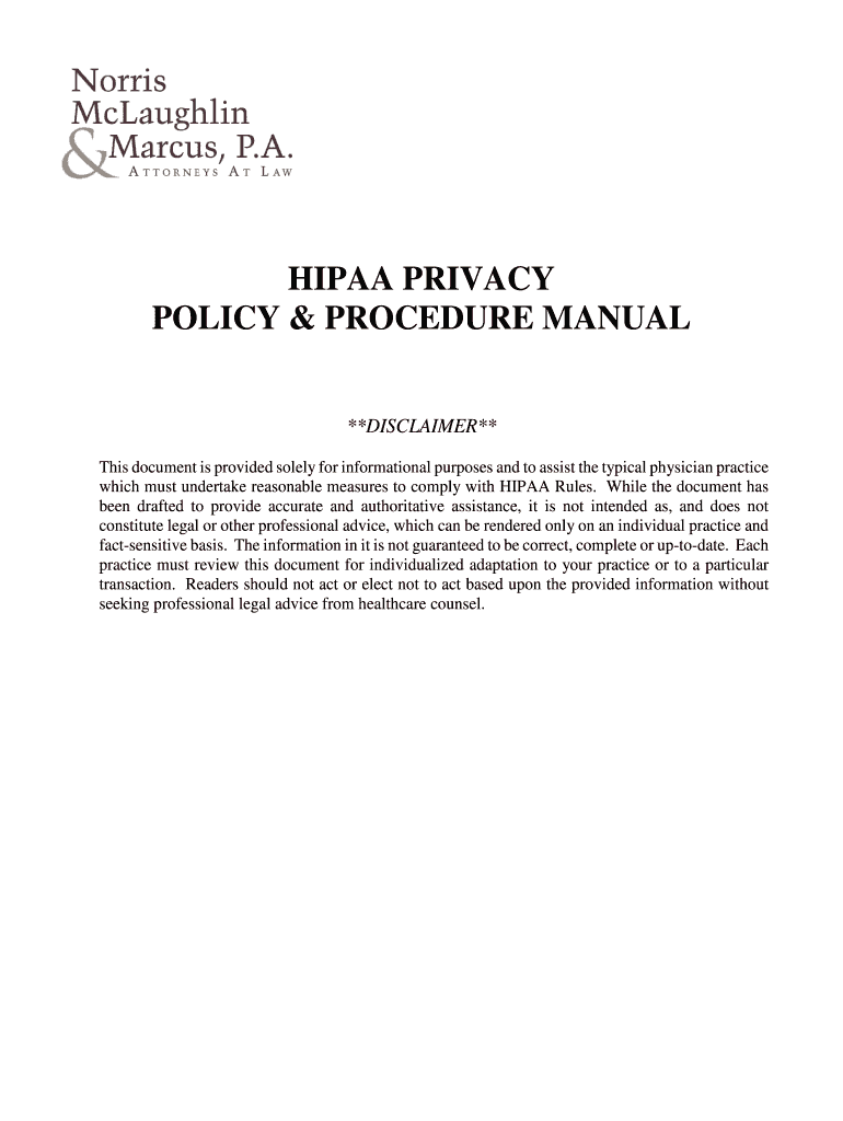 HIPAA PRIVACY POLICY & PROCEDURE MANUAL **DISCLAIMER** This document is provided solely for informational purposes and to assist the typical physician practice which must undertake reasonable measures