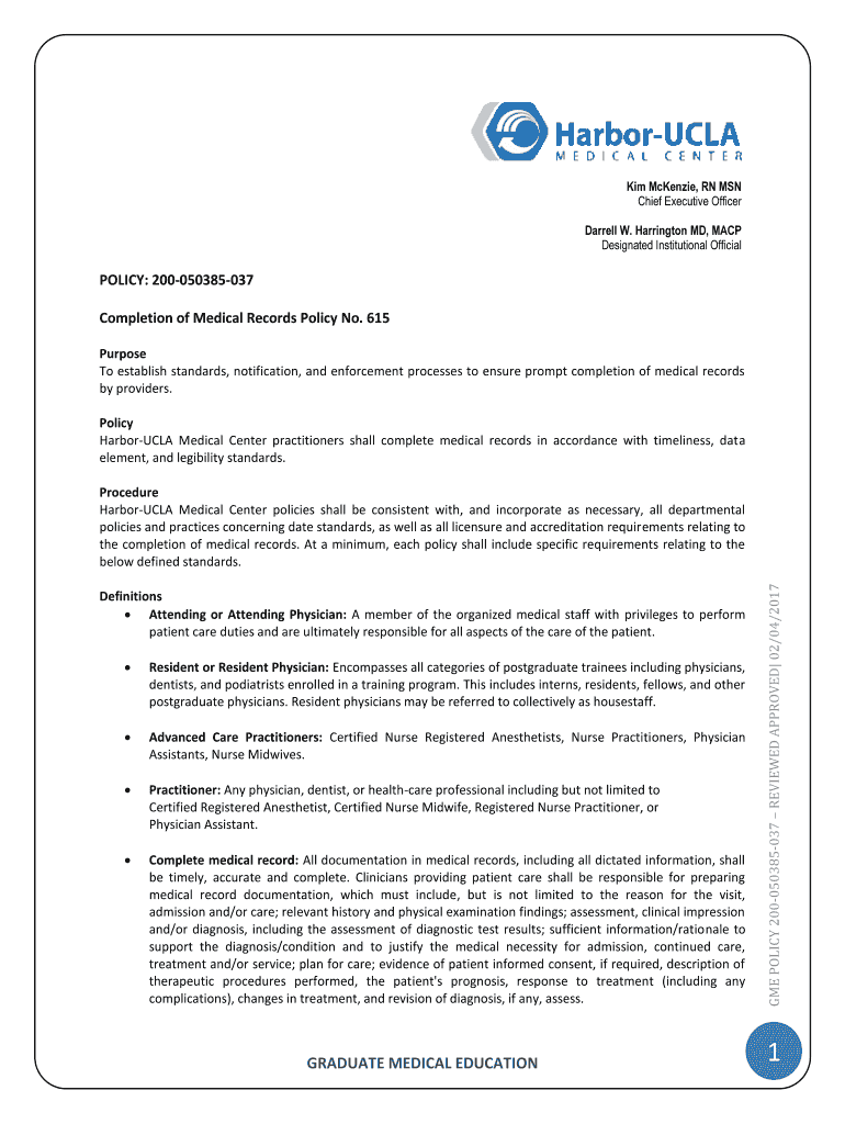 Kim McKenzie, RN MSN Chief Executive Officer Darrell W. Harrington MD, MAP Designated Institutional OfficialPOLICY: 200050385037 Completion of Medical Records Policy No. 615 Purpose To establish standards,