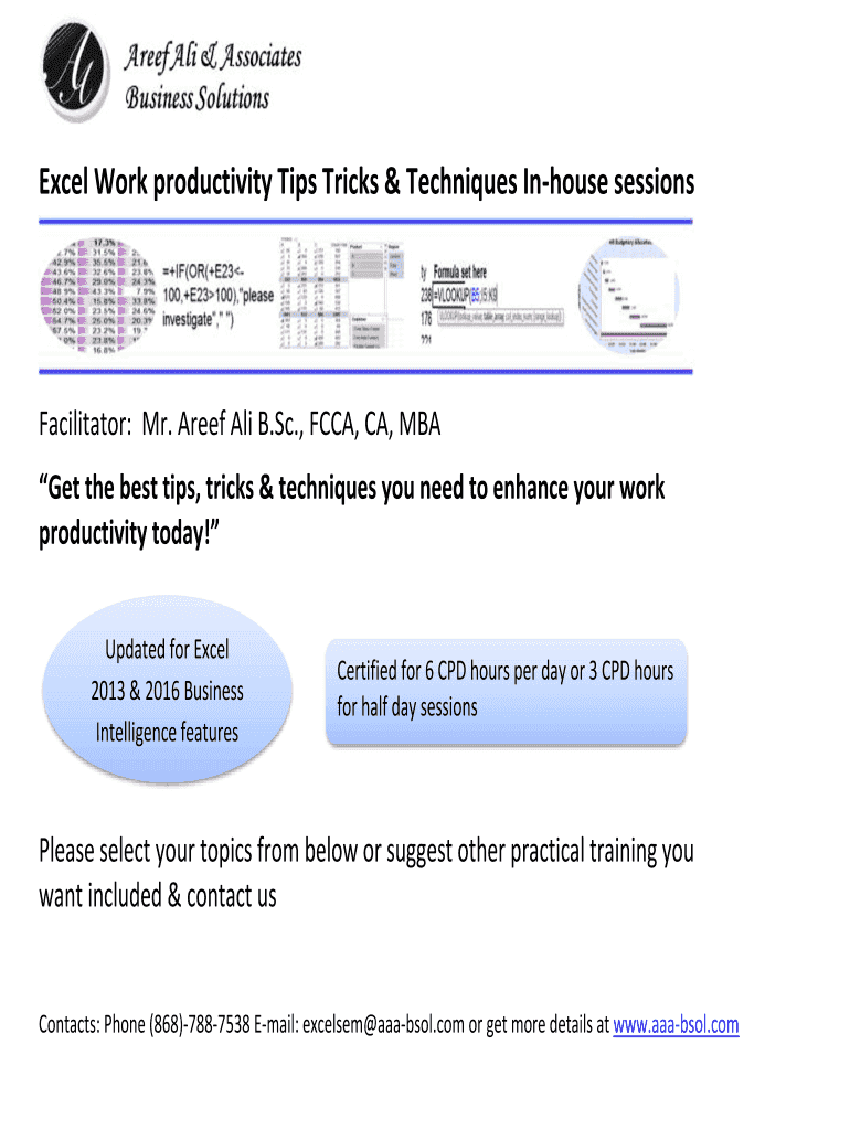 Excel Work productivity Tips Tricks & Techniques In house sessionsFacilitator: Mr. Reef Ali B.Sc., FCC, CA, MBA Get the best tips, tricks & techniques you need to enhance your work productivity today!