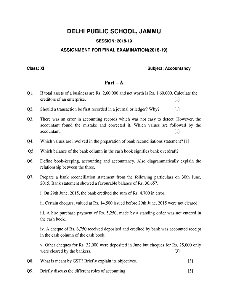 DELHI PUBLIC SCHOOL, JAMMY SESSION: 201819ASSIGNMENT FOR FINAL EXAMINATION(201819)Class: Subject: AccountancyPart A Q1. If total assets of a business are Rs. 2,60,000 and net worth is Rs. 1,60,000.