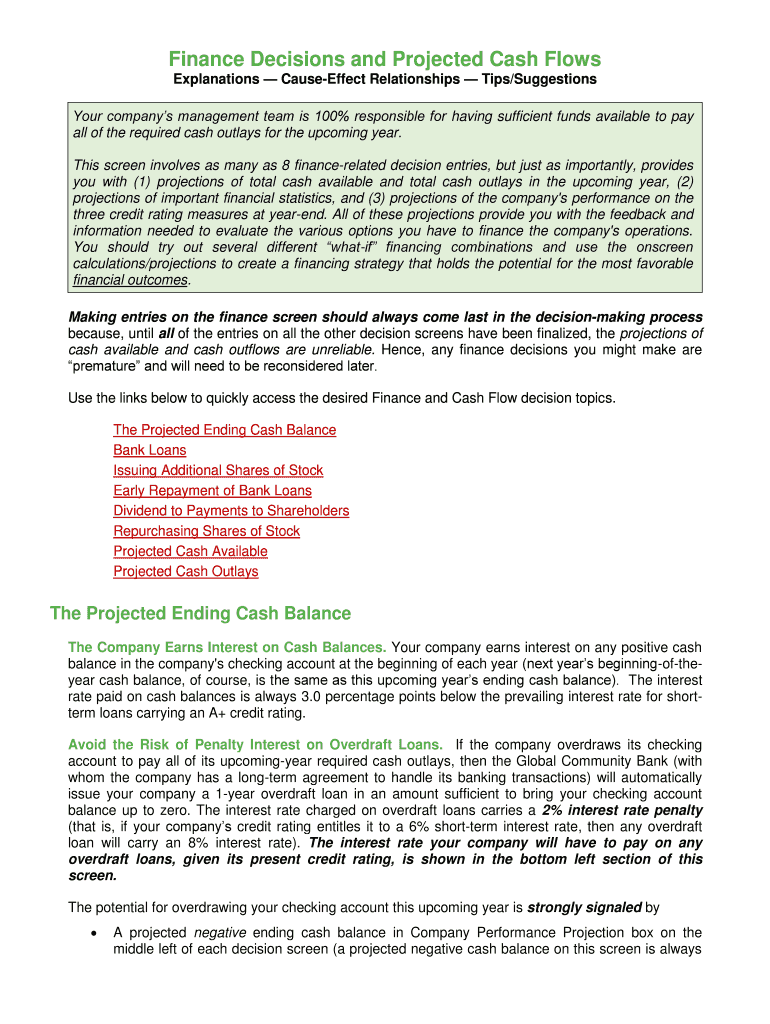 Finance Decisions and Projected Cash Flows Explanations CauseEffect Relationships Tips/Suggestions Your companies management team is 100% responsible for having sufficient funds available to pay all