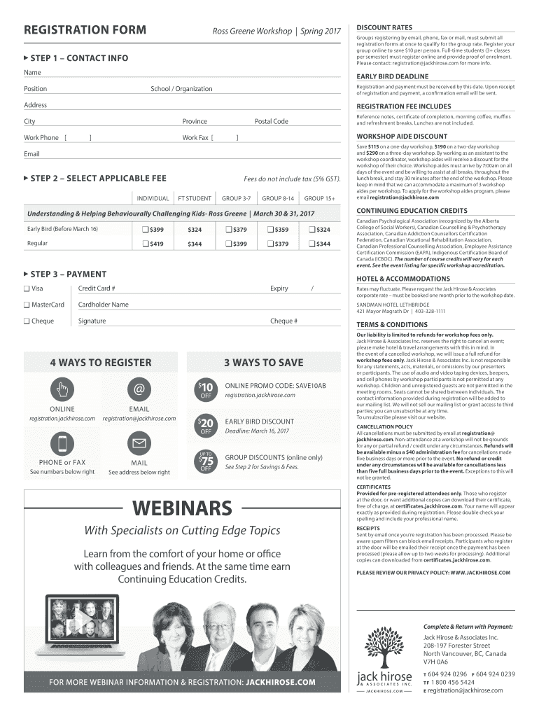 REGISTRATION FORM Ross Greene Workshop Spring 2017STEP 1 CONTACT INFO NameDISCOUNT RATES Groups registering by email, phone, fax or mail, must submit all registration forms at once to qualify for