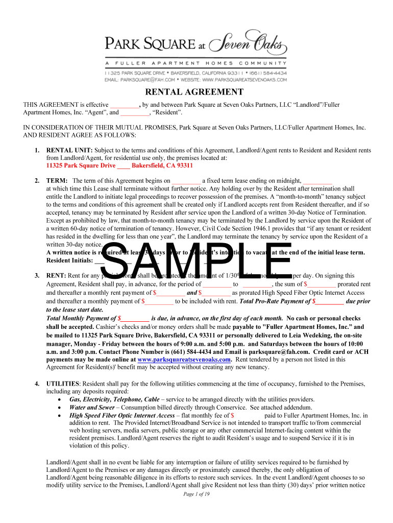 RENTAL AGREEMENT THIS AGREEMENT is effective, by and between Park Square at Seven Oaks Partners, LLC Landlord/Fuller Apartment Homes, Inc. Agent, and, Resident. IN CONSIDERATION OF THEIR MUTUAL PROMISES,
