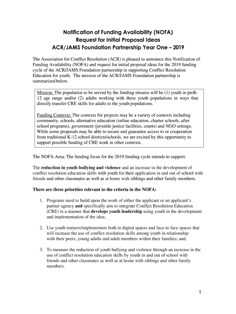 Notification of Funding Availability (NOVA) Request for Initial Proposal Ideas ACR/JAMS Foundation Partnership Year One 2019 The Association for Conflict Resolution (ACR) is pleased to announce this